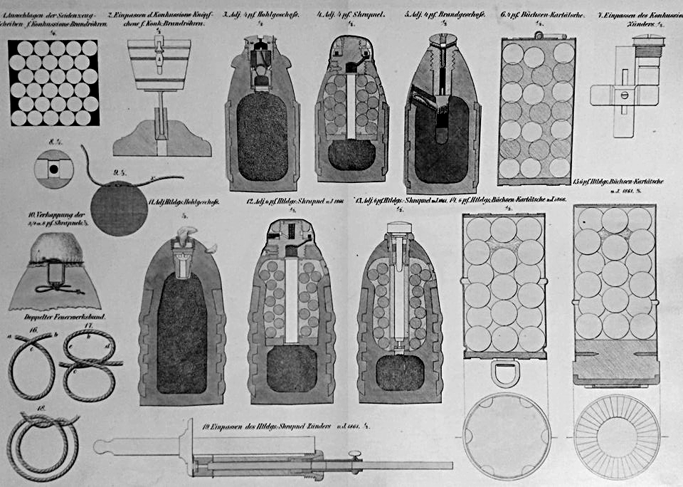 One upshot of the Austrian’s conservative thinking was a very short development time: within 6 months, during the winter of 1862/63, all of the new material for the weapon – including guns, carriages, and auxiliary equipment – was ready. Upon their introduction, the M.1863 field guns were actually some of the best field artillery guns of the period. The Austrians had more or less perfected the techniques used in producing rifled muzzleloaders. Three new field guns were adopted – a 3-pdr mountain gun, a lightweight 4-pdr for cavalry batteries and infantry brigades, and an 8-pdr field gun as a positionsgeschütz, a less mobile heavy gun. The M.1863 family not only replaced the heavier 6- and 12-pdr smoothbore guns in service, but also all howitzers. The design of the M.1863 guns and carriages was such that they were capable of delivering both direct- and indirect-fires. Four types of ammunition were adopted: explosive, shrapnel, and incendiary projectiles, as well as canister rounds. For the 4-pdr gun, ranges of 3,375 and 1,500 metres were achieved for the explosive and shrapnel projectiles, respectively. At the time of its introduction, the 4-pdr easily outranged many heavier, older guns. With a barrel weight of only 470 lbs, it had an impressive range-to-weight ratio and allowed for high mobility with a lightweight carriage.