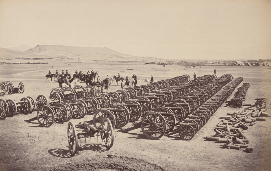 One image, labelled in pencil “Captured guns – Cabul”, shows many of the guns captured following the engagement (see Figure 1.2). The image, taken by John Burke at the Sherpur Cantonment, shows the commander of the Kabul Field Force, Major General Sir Frederick Roberts, and his staff on horseback inspecting the captured guns. It showcases the wide variety of sizes and patterns of artillery pieces in the Emir’s possession before the conflict. Although the rudimentary photograph and the arrangement of the guns—especially the smaller ones—makes them hard to count, the image shows at least 105. These include a mix of bronze, iron, and (likely) steel types, and both muzzle-loading and breech-loading designs. Mountain guns, howitzers, and mortars are all represented.